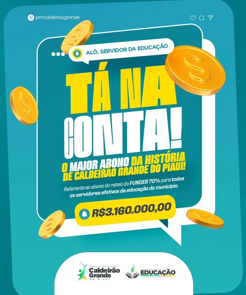 A Prefeitura de Caldeirão Grande do Piauí realizou o pagamento do abono salarial aos profissionais da educação básica pública vinculados à Secretaria Municipal de Educação, injetando mais de R$ 3,1 milhões na economia local.